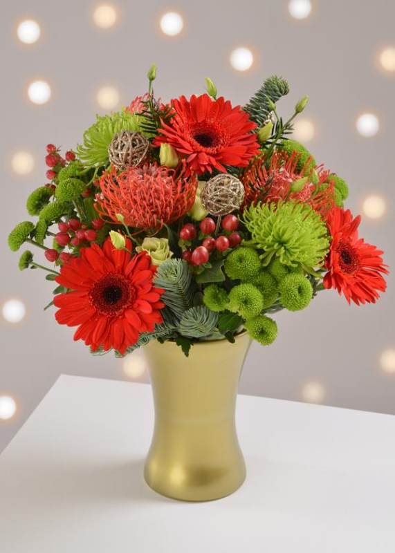 A mix of florist choice flowers in reds and greens make up this beautifully festive hand tied bouquet.