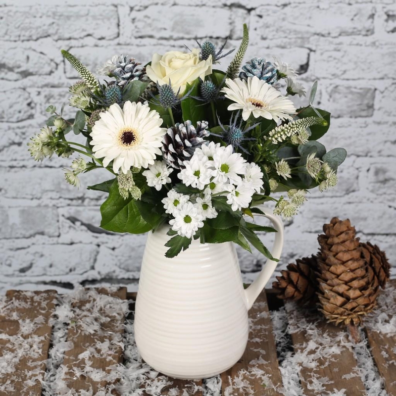 Hand tied bouquet with pine cones and thistle amongst a seasonal selection of flowers in whites and creams. Jug not included.